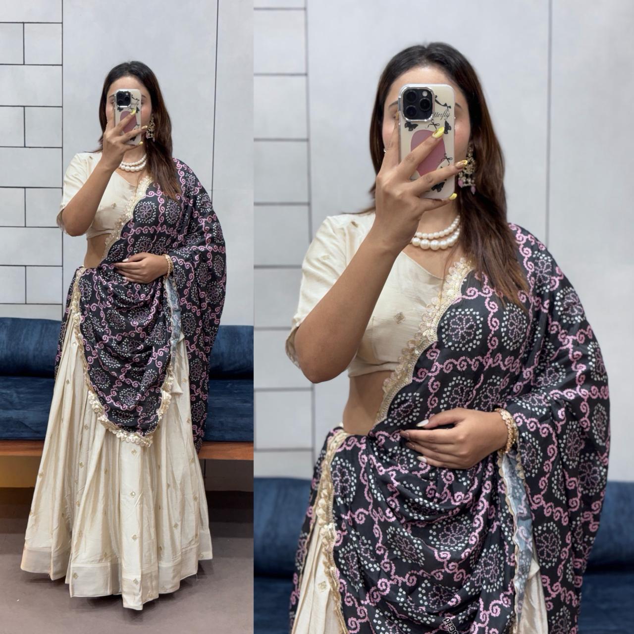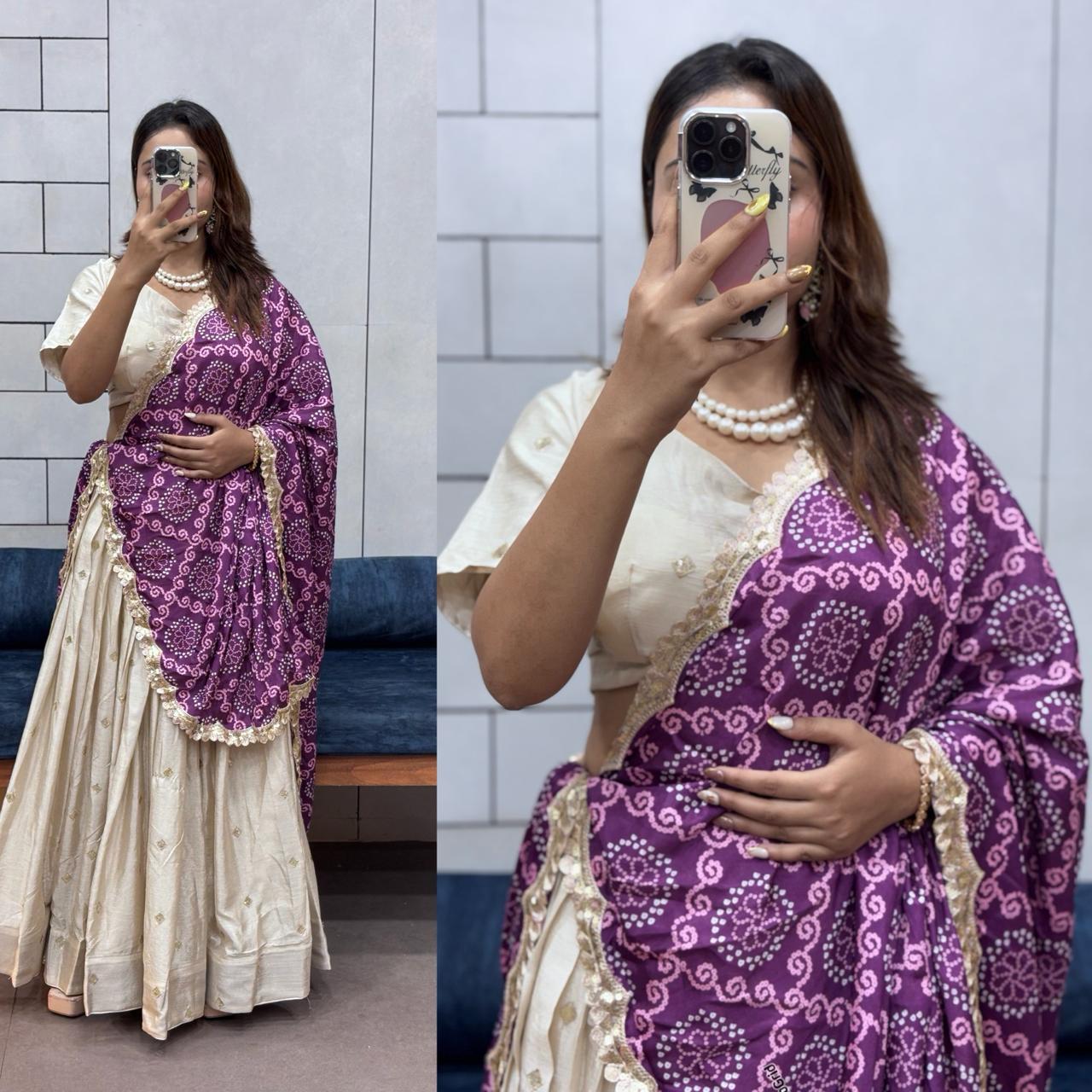 Chinon silk lehenga with floral embroidery work and fully stitched blouse in size upto XL with vichitra silk banshee dupatta