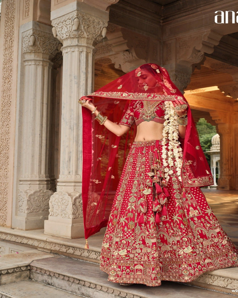Heavy bridal silk lehenga with khaki work and hand embroidery all over in size upto 40 inches , unstitched, with net dupatta